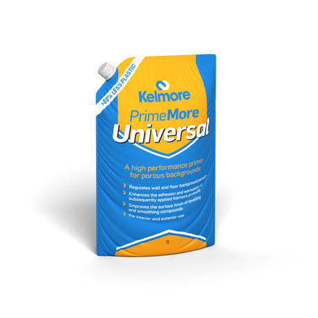 Kelmore’s PrimeMore Universal is a primer designed for use on porous/absorbent wall and floor backgrounds prior to applying tile adhesives or levelling and smoothing compounds. PrimeMore Universal regulates the porosity of the background, enhancing the workability, adhesion and strength of subsequently applied Kelmore products. When backgrounds are sufficiently primed using PrimeMore Universal, the surface finish of levelling and smoothing compounds will also be significantly improved. To help achieve total and uniform coverage, PrimeMore Universal is pigmented blue for enhanced visibility during application, and is suitable for interior and exterior use.