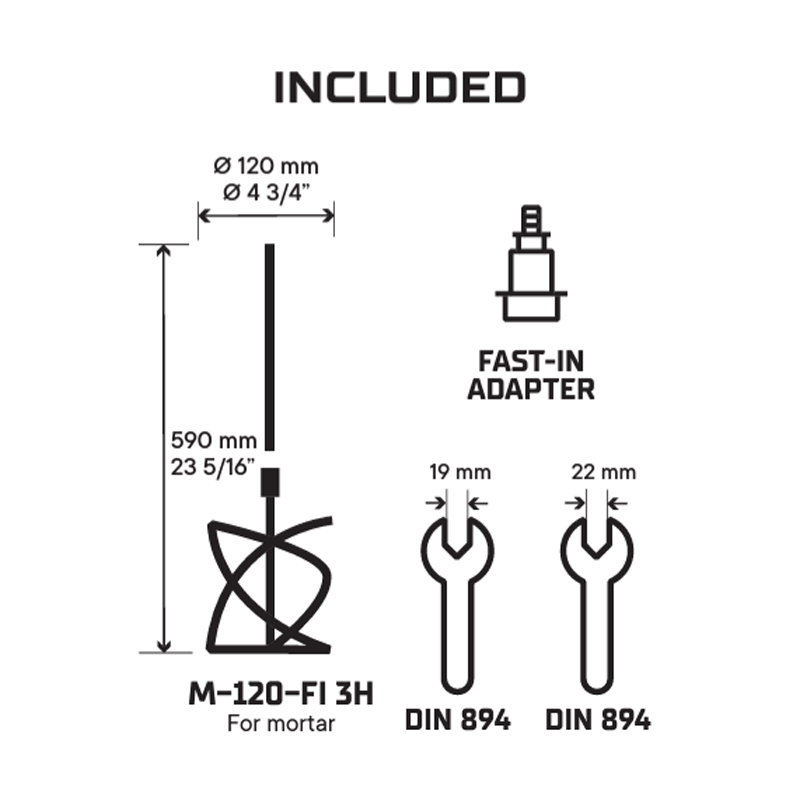 The RUBIMIX E-10 ENERGY CAS battery-powered electric mixer is ideal for mixing cementitious adhesives, resins, paints, and other materials. The transportability, manageability and convenience of not depending on a PowerPoint and the freedom and safety of working without cables are the main benefits of the RUBIMIX E-10 ENERGY CAS mixer. Equipped with a BRUSHLESS motor, the RUBIMIX E-10 ENERGY CAS is maintenance-free and significantly increases the life of the product. With the ENERGY CAS Li-Ion 18V - 5.2Ah battery, RUBI joins METABO's CAS platform. Compatible with the more than 300 products that are part of the CAS (Cordless Alliance System) platform, the ENERGY CAS Li-Ion 18V - 5.2Ah battery offers an approximate capacity of up to 90 litres (3 bags of ceramic adhesive). With the ENERGY CAS charger, the full recharge time of the battery is about 180 minutes. The ENERGY CAS Li-Ion battery has an LED display that indicates the remaining charge level to the user. If the display shows 4 green LEDs, it means that the battery is at 100% charge. The double handle with bi-material grip offers greater ergonomics and comfort to the user, and its shape facilitates better control and stability of the tool during mixing. The mechanical gearbox gives us two working speed ranges. These are controlled, in a very efficient way, with the trigger itself. To increase the safety of the mixer and to avoid possible unintentional start-up, the RUBIMIX E-10 ENERGY CAS has a safety lock on the handle. The RUBIMIX E-10 ENERGY CAS incorporates, as standard, RUBI's exclusive FAST-IN quick connection system, which makes it easier for the operator to assemble and disassemble the mixing rod in a quick and tool-free way. This allows a better transport and maintenance of the set. Together with the mixer, a 120 mm diameter detachable rod is incorporated (maximum capacity of the mixer), especially for mortars and cementitious adhesives with FAST-IN connection.